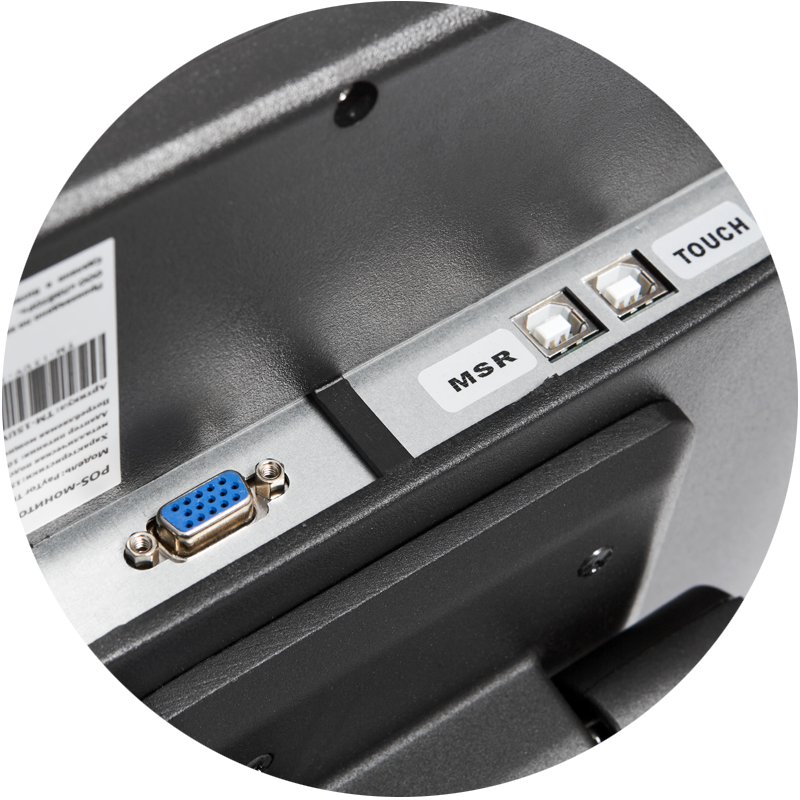Встроенный считыватель магнитных карт на 1-2-3 дорожки позволяет производить идентификацию сотрудника или клиента (в рамках реализации программы лояльности), а специальным образом утяжеленная подставка из алюминия с задней пластиковой крышкой не только придает монитору устойчивость, но и позволяет спрятать кабели, обеспечивая аккуратный внешний вид рабочего места.